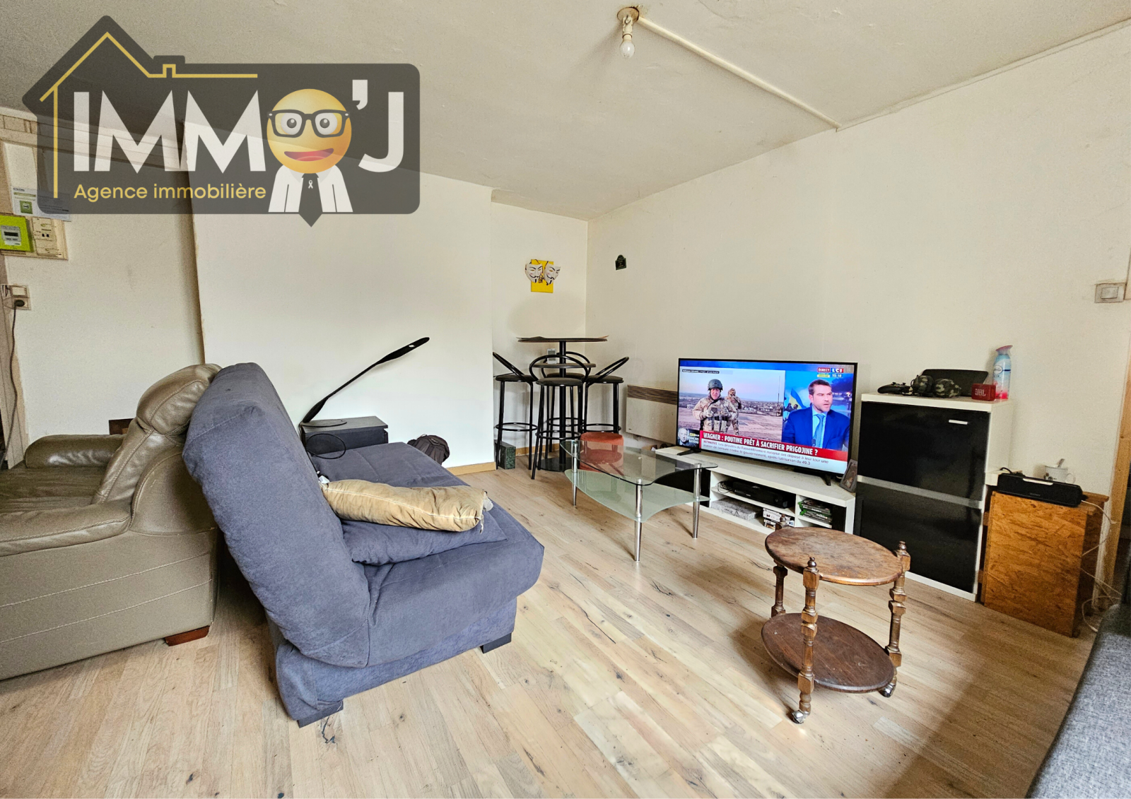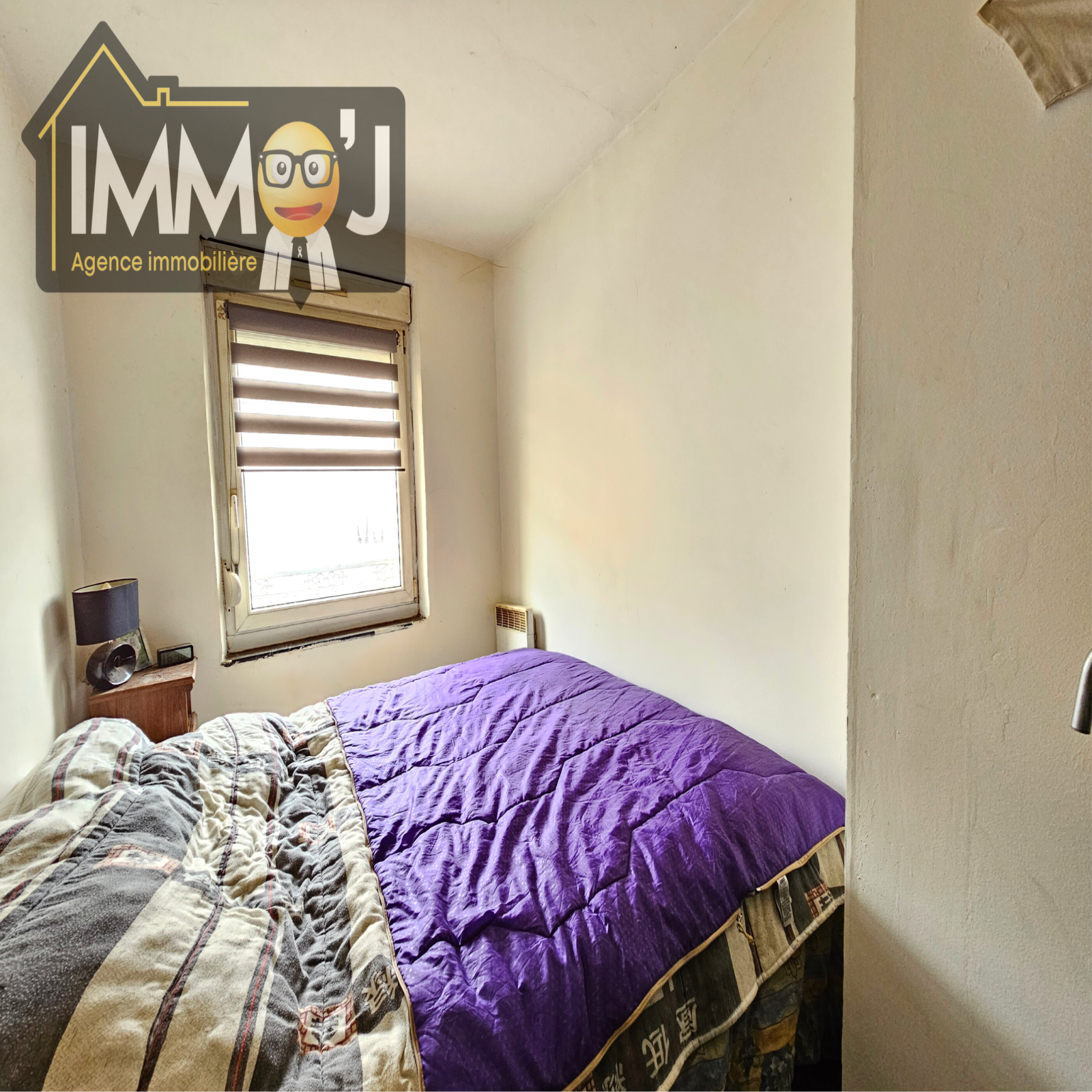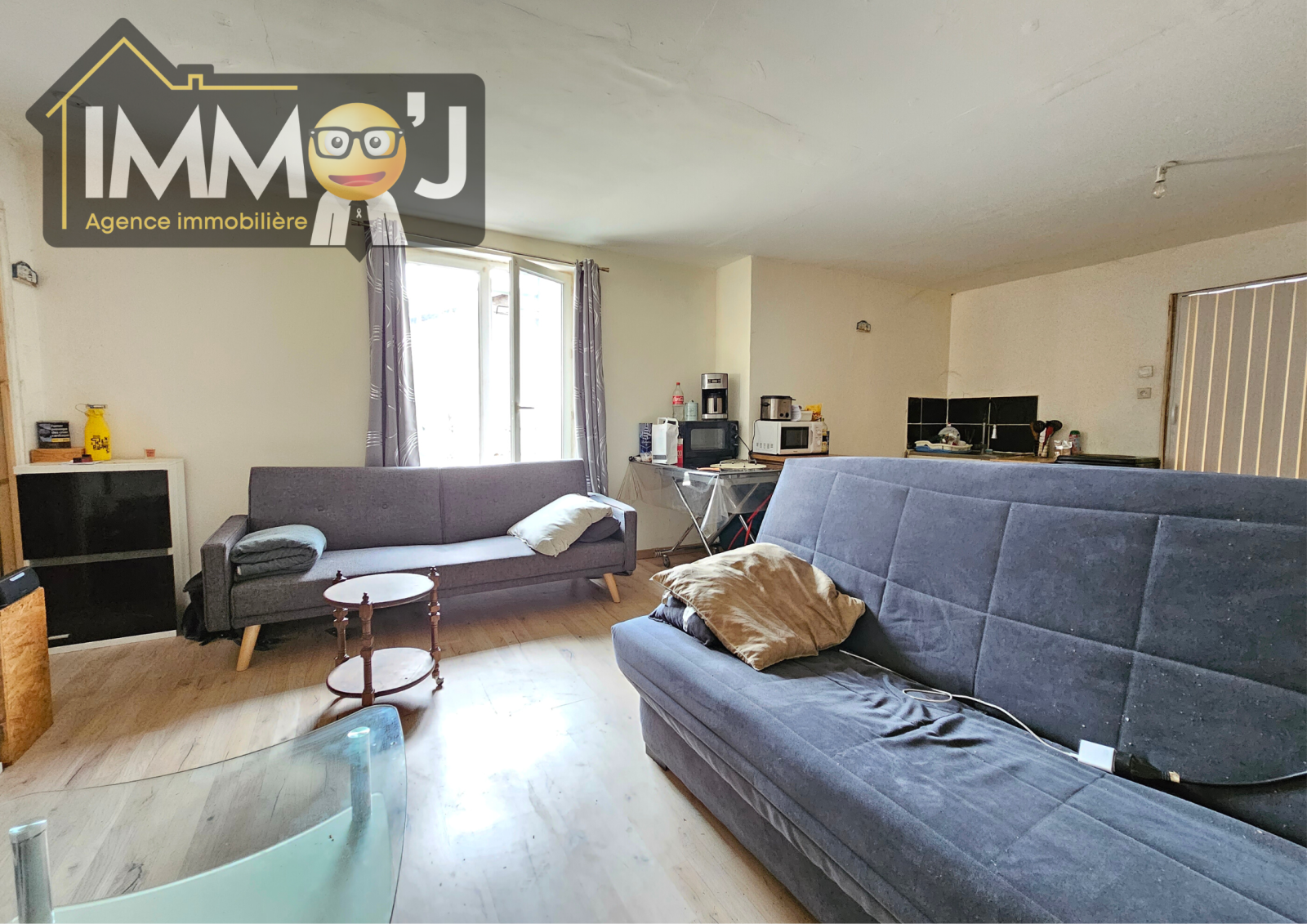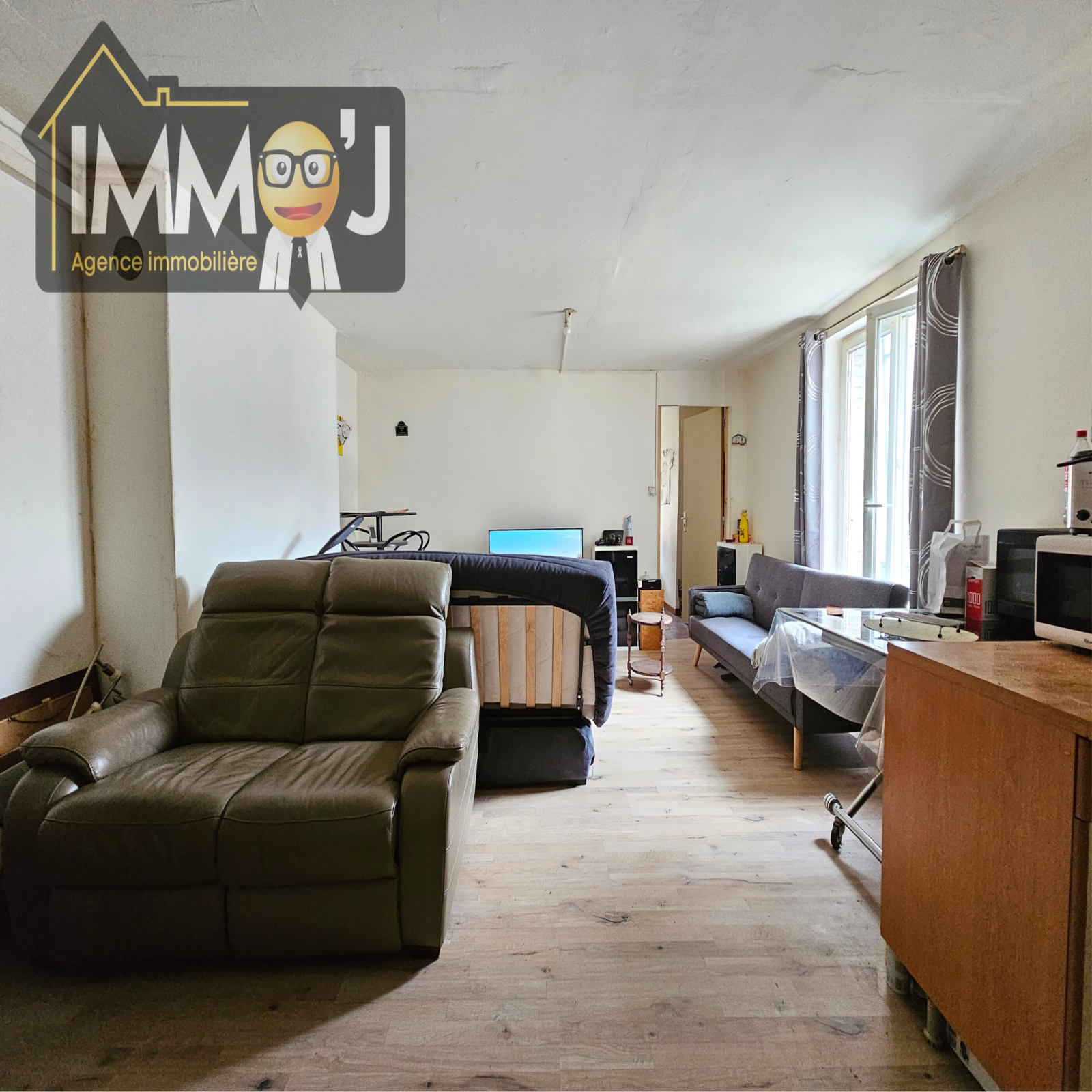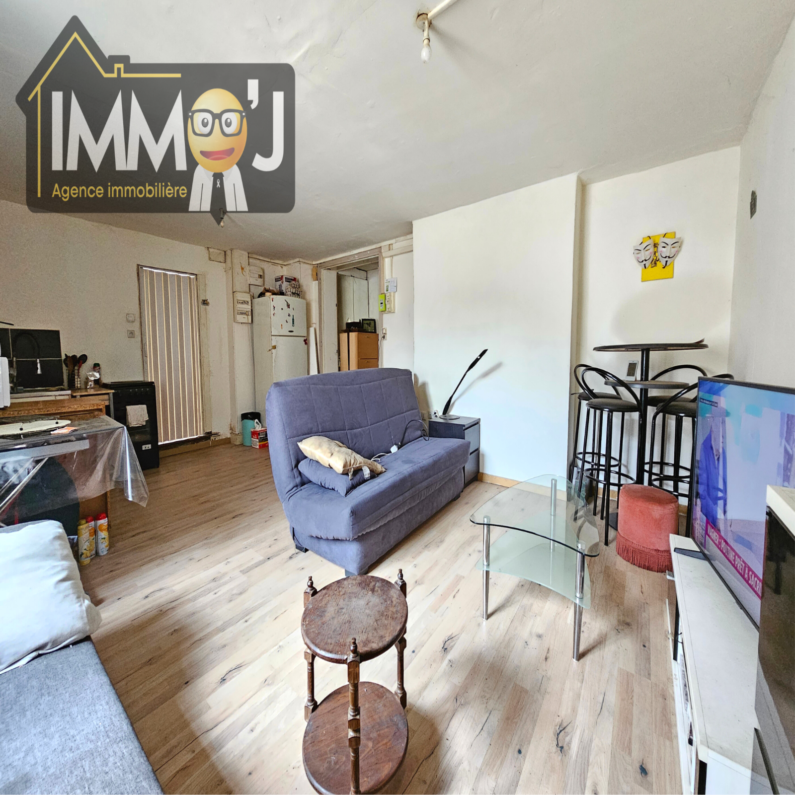 Suivez-moi, Je vous fais visiter ! Nous voilà arrivés dans une petite entrée qui dessert la pièce de vie où on retrouve le coin cuisine Juste à droite. Derrière, Je vous invite vers la salle de bains avec les WC et l'emplacement de la machine à laver. De l'autre côté du séJour, nous avons la chambre côté rue avec son double vitrage PVC !